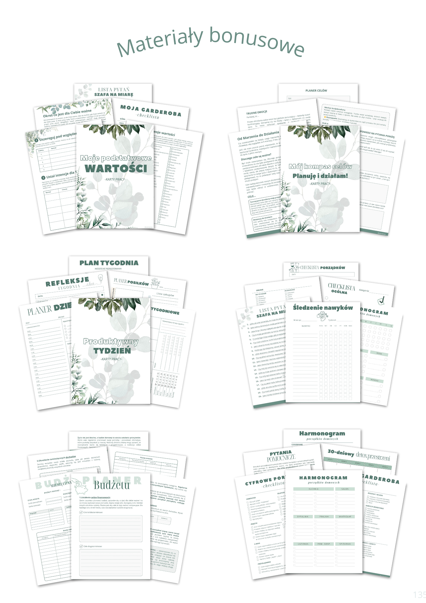 • Refleksje, które zmienią Twoje podejście: 40 pytań refleksyjnych pomoże Ci lepiej zrozumieć, dlaczego gromadzisz rzeczy i co utrudnia Ci ich usuwanie. Dzięki nim spojrzysz na porządki z nowej perspektywy i łatwiej wypracujesz nawyki, które pozwolą Ci utrzymać ład w domu i w codziennym życiu.