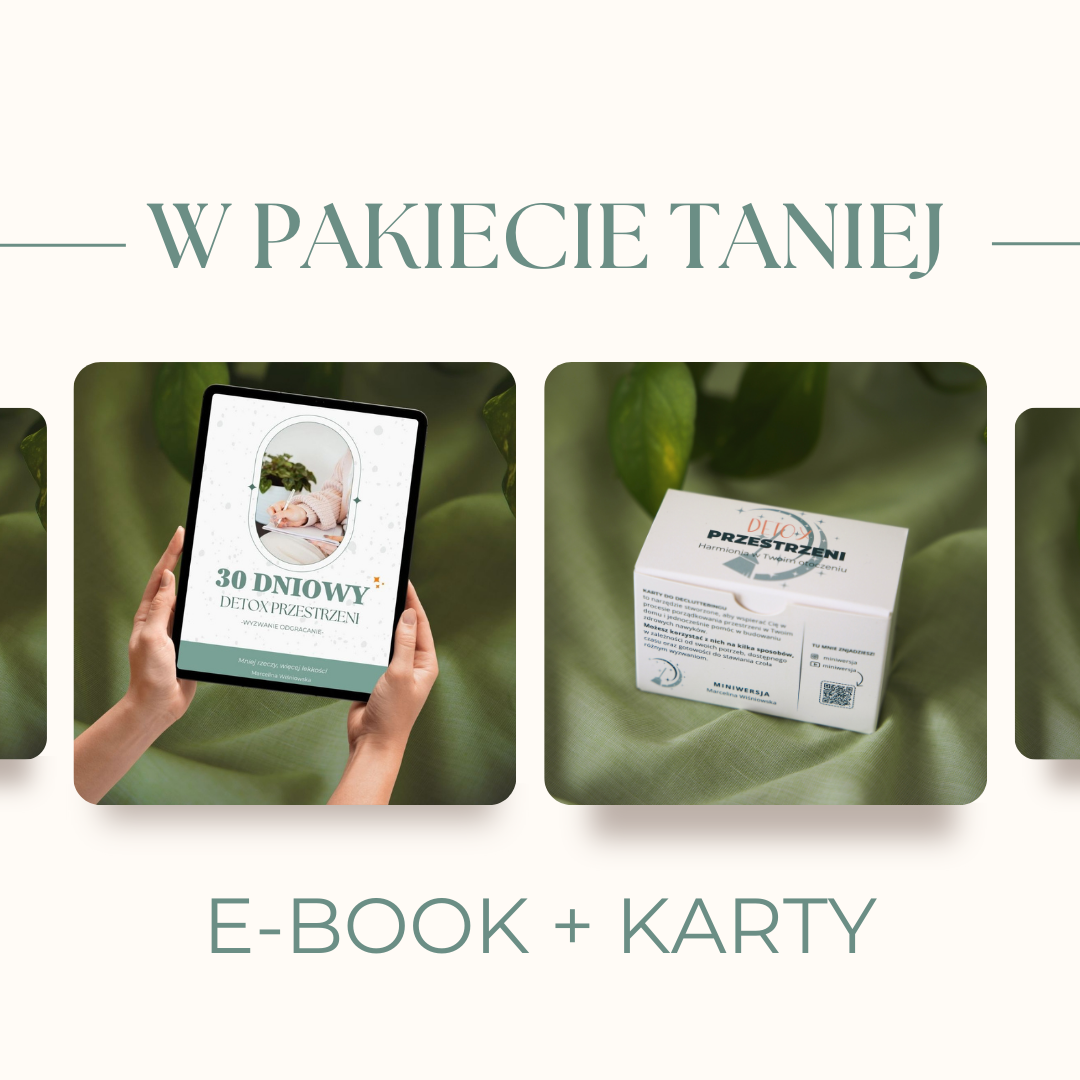 E-book „30-dniowy detox przestrzeni” + Karty do Declutteringu to najlepszy wybór dla osób zdecydowanych na głęboką i trwałą zmianę. Połączenie strategicznego planu z e-booka z codziennym, praktycznym wsparciem kart gwarantuje najlepsze rezultaty.